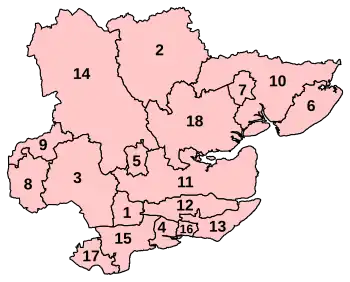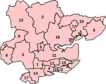 The county of Essex (which includes the unitary authorities of Southend-on-Sea and Thurrock) is divided into 18 parliamentary constituencies (sub-classified into six of borough type and twelve of county status, affecting the level of expenses permitted and status of returning officer).