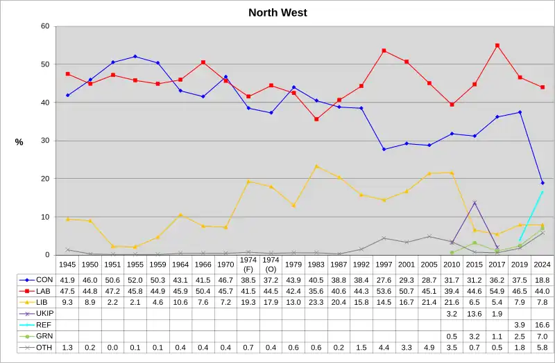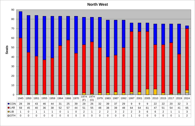 The region[1] of North West England is divided into 73 parliamentary constituencies, of which 34 are borough constituencies and 39 are county constituencies. Following the 2024 general election, 65 were represented by Labour MPs, 3 by Conservative MPs, 3 by Liberal Democrat MPs, 1 by the Speaker, and 1 by an Independent MP. Reform UK gained 1 seat from Labour in the 2025 Runcorn and Helsby by-election.