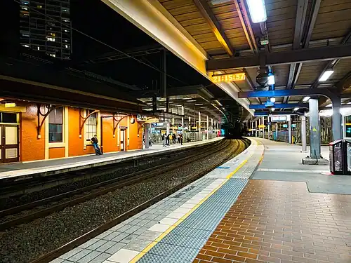 Parramatta railway station is a heritage-listed railway station located on the Main Western line, serving Parramatta in New South Wales, Australia. It is served by Sydney Trains' T1 Western Line, T2 Leppington & Inner West and T5 Cumberland Line services and NSW TrainLink Blue Mountains Line, Central West Express and Outback Xplorer services.