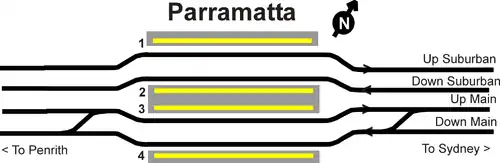 As part of the Parramatta Turnback project, an additional crossover from the Up Main to the Down Main was constructed (not shown) west of the station.[9]