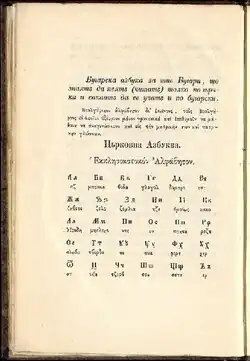In 1852, a small group of Bulgarian students established a Bulgarian cultural society named Balgarska matitsa (Bulgarian Motherland) in St. Petersburg and he was among those who joined the group.[13] The Matitsa was replaced later by the Obshtestvo bolgarskoy pismennosti (Society of Bulgarian literature), founded in Istanbul in 1856, where he joined too. The Obshtestvo soon had its own magazine: Balgarski knizhitsi (Bulgarian Booklets) where Zografski published a lot of articles. Zografski as a Bulgarian Exarchate bishop was also active in the struggles for the establishment of a distinct Bulgarian Orthodox Church, when the modern Bulgarian nation had been established.[14] Besides his religious activity, Zografski was also an active man of letters. He co-operated with the Bulgarian Books magazine and the first Bulgarian newspapers: Savetnik, Tsarigradski Vestnik and Petko Slaveykov's Makedoniya. In 1857, he published a Concise Holy History of the Old and New Testament Church. In the following year he published Elementary Education for Children in Macedonian vernacular. In 1859, as the director of the Bulgarian school in Istanbul, he composed the text carved on a copper plate embedded in the foundations of the new Bulgarian church there.