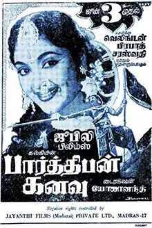 Parthiban Kanavu (transl. Parthiban's Dream) is a 1960 Indian Tamil-language historical fiction film, directed by D. Yoganand. The film stars Vyjayanthimala, Gemini Ganesan and S. V. Ranga Rao, with Ragini, S. V. Subbaiah, Kumari Kamala, T. S. Balaiah, P. S. Veerappa and S. A. Ashokan in supporting roles.[1] It is based on the 1942 historical novel of the same name, written by Kalki Krishnamurthy.[2] The film also had actor K. Balaji in a special appearance and actress B. Saroja Devi as an extra.