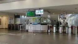 As of June 2021, Pasir Ris is the eastern terminus of the EWL. The next station on the line is Tampines station. The official station code is EW1.[59] When it opened, it had the station code of E12[60] before being changed to its current station code in August 2001 as a part of a system-wide campaign to cater to the expanding MRT System.[61][62] The station operates between 5:28 am and 11:23 pm.[63] Train frequencies range from 2 to 5 minutes depending on peak hours.[64]