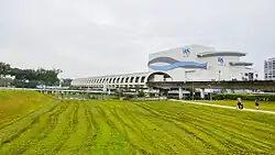 Pasir Ris MRT station (/ˌpɑːsər ˈrɪs, -seɪ-/) is an elevated Mass Rapid Transit (MRT) station on the East West line (EWL) in Pasir Ris, Singapore. Situated along Pasir Ris Central adjacent to Pasir Ris Bus Interchange, Pasir Ris Mall and the White Sands Shopping Mall, it is the eastern terminus of the EWL. The station exterior has the characteristic dome-shaped segmented roof also seen on other elevated EWL stations.