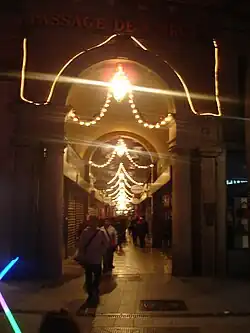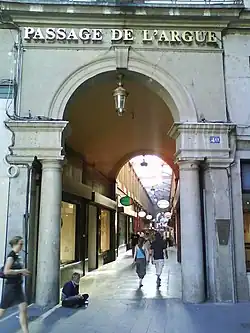 The Passage de l'Argue (French pronunciation: [pasaʒ də laʁɡ]) is a covered arcade in the Bellecour quarter, in the 2nd arrondissement of Lyon, which connects the Rue de la République to the Rue Édouard-Herriot and the Rue de Brest.[1] It is continued across the Rue de Brest by the Petit Passage de l'Argue, which was part of the main passage until the road was constructed. The Passage de l'Argue is one of the oldest arcades in the French provinces, built at the same period and on the same model as Parisian arcades.[2] Home to many luxury retailers, it plays a significant role in the trade of the Presqu'île.[3]