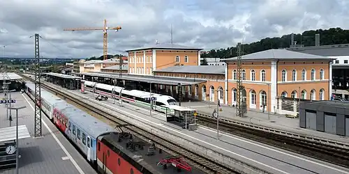Passau Hauptbahnhof is the main railway station at Passau in Bavaria, Germany. Built in 1860, it has eight platforms, of which three are bay platforms and three are through tracks. The ca. 130 m long station building is built in the classic style.