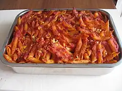 Pasta al forno (lit. 'pasta to the oven', i.e. 'baked pasta'), also known as timballo di pasta, is a typical dish of Italian cuisine, made of (usually short) pasta covered with béchamel sauce, tomato sauce, and cheese, and cooked in the oven.