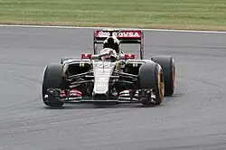 Maldonado continued to drive for Lotus in the 2015 season. In March 2015, before the season started, the Lotus car suffered a brake failure causing him to crash during testing at Catalunya.[67] At the Australian Grand Prix, Maldonado was hit by Felipe Nasr and crashed out of the race at the second corner of the first lap after he overtook 3 cars at the start and was in 6th position.[68] At the Malaysian Grand Prix, Maldonado's car suffered a puncture after he was hit by Valtteri Bottas, and he was later given a 10-second time penalty for speeding behind the safety car.[69] He accrued three penalty points on his licence for the infringement, taking his tally to eight within the previous year.[70] At the Chinese Grand Prix, Maldonado suffered a brake issue that caused him to go off-track when entering the pits, and had to be recovered by the marshals. A couple of laps later he spun the car.[71] On lap 49, Maldonado was hit by Jenson Button in a braking zone and spun; Maldonado was later forced to retire.[72] At the start of the Bahrain Grand Prix, Maldonado parked his car in the wrong grid slot, and accordingly, was given a 5-second time penalty.[73] On the first lap of the race Maldonado was hit by Max Verstappen, damaging Verstappen's front wing; Maldonado also was hit by Massa's car, damaging its floor.[73] Following the race, Maldonado admitted that his reputation for crashing comes because he takes more risks as he approaches the limits.[74]