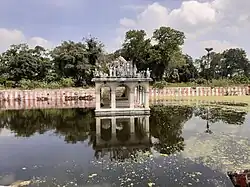 Pasupatheeswarar temple is located in Pandanallur, a village in the Tamil Nadu state highway SH150, on the Tirupanantal - Vaitheeswarankoil road, in the South Indian state of Tamil Nadu. The temple has a five-tiered rajagopuram, the entrance tower and all the shrines of the temple are enclosed in concentric rectangular granite walls. The temple covers an area of close to an 2 acres (0.81 ha). The temple has three prakarams (closed precincts of a temple) and many mandapams (halls). The temple faces east and is entered via the rajagopuram (gateway tower). The presiding deity in the form of lingam is housed in the sanctum. Following the legend, the image of the Lingam has a mark of the cow's hoof. The Lingam is white in colour and ablution is not performed for the presiding deity.[1] The attached hall, the ardhamandapa measures the same width as the sanctum, while its length is twice the sanctum. The ardhamandapa projects towards the east. The Mukhamandapa has a square structure. There are five devakoshtas that cover the exterior walls of the sanctum. The images of Dakshinamurthy and Brahma are the only ones remaining out of the five. The presiding deity of the temple is Pasupatheeswarar, housed in the sanctum. The consort Mangalambiga, is located in a south facing shrine.[1] The temple has four bodies of water associated with it. The principal water tank is called Kamadhenu Theertham, which is located outside the main entrance of the temple.[5]