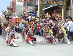 Pat Ka Chiong (Chinese: 八家將; Pe̍h-ōe-jī: Pat-ka-chiòng) originated from the Southern Han folk beliefs and myths, and usually generally refers to eight members of the godly realm. The general understanding of the origin of Pat Ka Chiong is that it is derived from the existence of eight generals who performed exorcism of evil spirits for the Wufu Emperor (五福大帝). These eight generals became revered as the gods of the underworld, and are represented as the bodyguards or attendants for the temples of the nether Gods such as the Dongyue Emperor (東獄大帝), Yama (King of Hell, 閻羅王) and City Gods (城隍). Gradually Pat Ka Chiong evolved to appear also as bodyguards to Ong Yah (Royal Lord, 王爺) and Matsu (媽祖), and at many other temples. Later on, believers at those temples dressed up as Pat Ka Chiong in order to defend the Gods. These actions evolved into Taiwanese folk activities, which are part of the Bu-tin (Military Array, 武陣) in Tin-thau (Taiwanese troupes, 陣頭). Pat Ka Chiong is responsible for the capture of ghosts and evil spirits, bringing safety and good luck, and providing protection. They contain a strong religious nature, and Tin-thau (Taiwanese troupes, 陣頭) often seem as mysterious, threatening and serious. Some Pat Ka Chiong members have relations with Taiwanese gangsters.[1]