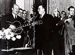 The band's theme song, an adaptation of "I Like Mountain Music", a popular fiddle song, included the line "Pass the biscuits, Pappy!" which gave the elder O'Daniel his nickname.[3] He announced his Texas gubernatorial campaign in 1938 on the radio during the Hillbilly Boys' radio show[1] and make "Pass the biscuits, Pappy!" his campaign slogan.[2] As he had done earlier with the Doughboys, O'Daniel fitted out a bus with placards advertising Hillbilly Flour and took his band on the road, but this time to mount a political campaign. O'Daniel, his son Pat and the other Hillbilly Boys drove more than 20,000 miles in their bus promoting O'Daniel's political ambitions and his flour.[2] By most accounts, the band drew rapt crowds in even the smallest town. When the tour bus hit Houston, it drew an estimated 26,000 people, the largest crowd ever for a political rally in Texas at that time.[1]