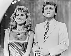 In 1981, Merv Griffin asked Sajak if he would be interested in taking over the duties as host on Wheel of Fortune from Chuck Woolery. However, Fred Silverman, the president and CEO of NBC, rejected his hiring, claiming Sajak was too local, and Griffin responded by imposing a moratorium on new tapings until Sajak was hired.[10] The issue became moot when Silverman was dismissed due to repeated programming failures and replaced by Brandon Tartikoff. Sajak, who had already hosted two game show pilots in 1980, Press Your Luck for Ralph Edwards (no relation to the 1983 CBS game show of the same name) and Puzzlers for Mark Goodson, accepted the position. From 1983 to 1989, Sajak hosted both the daytime (NBC) and syndicated evening versions of Wheel of Fortune; Sajak continued to host the latter version until 2024. With Sajak returning for his 36th season in 2018–19, he became the longest-running host of any game show, surpassing Bob Barker, who hosted The Price Is Right from 1972 to 2007. Sajak was officially honored as such by the Guinness World Records with the episode taped on March 28, 2019, and aired May 8, 2019 (two days before the primetime version's 7,000th episode).[11][12]