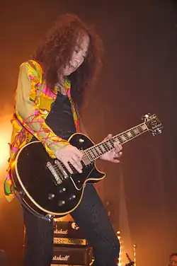 Pata is noted as the only member of X Japan who plays American-made instruments, almost always seen playing a vintage Gibson Les Paul. His favorite is a black Les Paul Custom that is estimated to be from around 1972.[52][b] Nicknamed "Jōmu" (常務; "Managing Director"), he has owned it since his amateur days.[53] Its frets have been replaced many times, the bridge has been replaced several times, and the back of the neck was shaved down to be easier to play. The neck has also been broken and repaired twice, which has resulted in the serial number on its headstock being obscured when it was repainted.[55] He also often uses a 1955 Goldtop Les Paul Standard, whose paint is rubbed down to the wood, earning it the nickname "Hage" (ハゲ; "Bald").[53] It originally belonged to a guitar tech, but after borrowing it, Pata traded a 1959 reissue for it.[56] Its pickups and tailpiece were already altered when he acquired it, the former having been swapped out for humbuckers.[53] Previously, Pata often used a yellow 1959 Standard nicknamed "Ichi-Gō" (1号; "Number 1").[53][c] He bought it in Los Angeles just before recording X's album Jealousy (1991), which features the guitar extensively.[57] Although he still uses it for recording, the 1959 has been retired from live performances since 2008 due to its value, which is reportedly enough to buy a house.[53] Since X Japan's reunion, Pata occasionally uses a wine red 1976 Custom, which has a Tom Holmes 453 pickup in the rear.[53] He also owns a white 2008 Custom that he often uses at home and calls "Panda", because the back of its headstock is painted black.[58]
