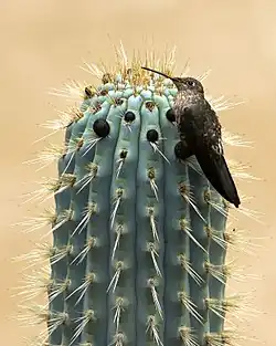 It regularly feeds from the flowers of the genus Puya in Chile, with which it has a symbiotic relationship, trading pollination for food.[18][23] As a large hovering bird, particularly at high altitudes, the giant hummingbird has extremely high metabolic requirements. It is known to feed from columnar cacti, including Oreocereus celsianus and Echinopsis atacamensis ssp. pasacana, and Salvia haenkei.[19][24][25]