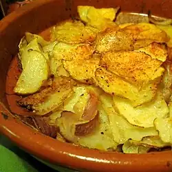 Patatas a lo pobre (lit. 'poor man's potatoes') is a simple potato dish from Andalusian cuisine. To make the dish thinly sliced potatoes are fried in olive oil to a very soft consistency (like confit potatoes) with onion. Then the oil is drained and garlic, parsley and vinegar are added to the hot frying pan to season the finished dish.[1][2] They can also be served with an egg (con huevo).[1] Some other ingredients like bell peppers, garlic and wine vinegar can be used.[3]