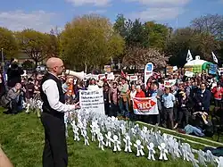 Harvie is a supporter of Scottish independence and voted 'Yes' in the 2014 Scottish independence referendum. In the run up to the referendum, he was part of the Yes Scotland campaign and campaigned alongside Nicola Sturgeon.[19] While he campaigned in-favour, not as a 'nationalist', Harvie stated the cause for independence was "for a vision of Scotland as a peaceful country with social justice, equality and environmental protection at its core".[20]