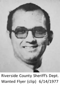The police soon had also discovered that LaMay had been seen in the company of Kearney and Hill.[12] Warrants were issued for the arrest of Kearney and Hill on June 3.[40] On May 26, Kearney had sent a letter of resignation to his job as well as his security badge, and the two fled to El Paso, Texas.[38] The fugitives' families persuaded the pair to return and to turn themselves in.[41] Kearney surrendered at the Riverside County Sheriff's Office on July 1, 1977. Following his surrender, he pointed at a wanted poster and claimed to be the suspect.[38] Kearney and Hill were put on a $500,000 bond.[42][43]