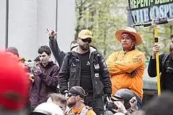 ![]() Joey Gibson, founder of Patriot Prayer, at a 2017 Seattle rally with Proud Boys members | |