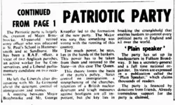In 1965, Braybrooke said that, at the next election, his party would "have the support of the New Liberals, with whose policies the Patriotic Party is in sympathy".[2] In 1966, Braybrooke said that his party "now has the support of the New Liberals under Mr Alan Lomas, and the League of Empire Loyalists".[3]