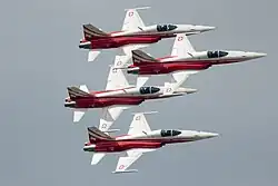 The Patrouille Suisse is an aerobatic team of the Swiss Air Force. The team flies six Northrop F-5E Tiger II fighter jets.