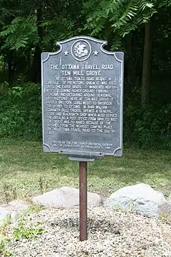 Ten Mile Grove is said to be the earliest settlement in Patton Township with about a dozen families residing there in 1853. It was located on the Danville-Ottawa road and named such because it was ten miles (16 km) from the nearest settlement.[5] The grove is partly contained in the Howard Thomas Memorial Nature Preserve.[6] The preserve, containing many Bur oak, sustained damage in a 2004 wind storm which felled numerous trees. Thirty to fifty percent of trees were felled in some portions, especially the western part. Volunteers cleared trees from the trails, one of which had 17 trees blocking it.[7]