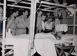 Bob Hope and his 1944 USO troupe visiting a hospital ward in the South Pacific (from left) Tony Romano, Jerry Colonna, Bob Hope, Patty Thomas, and Frances Langford.