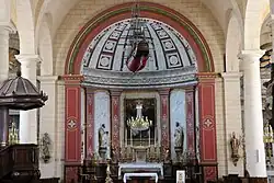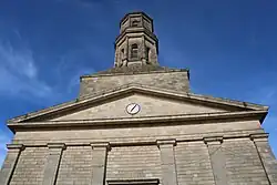 The Saint Martin's church is situated in the heart of Pauillac on Marshal Joffre Square. In November 1824 were laid the foundations before it would be delivered to worship in May 1828 and completed in 1829. The church was partly built out of the materials from the former church which had become too small. The Bordeaux architect Armand Corcelles was inspired by Greek art. The western façade is topped by a huge pediment which supports an octagonal tower made of two superimposed towers. The first tower houses three bells. Two of them date from 1784 and come from a former church. The third bell, cracked by too brisk and cheerful ringing during the Liberation in 1945, was melted again, baptized and named Edouard-Jeanne-Victoire in 1946. Inside, the nave has eight doric columns. In the choir, the white marble baroque style main altar is covered by a semi-dome. A canopy just above the altar lights it perfectly. An oculus, on a baroque piece of sculpture background, illuminated by the rising sun, represents the triangle of the Divine Trinity. This church also has an ex-voto: a small replication of the warship Saint Clement, hanging from the vault in the centre of the nave. It was offered in 1836 by the pilots and coastal pilots of Pauillac: "To honor the memory of Pope Saint Clement, the patron saint of Pauillac naval station sailors, pilots, coastal pilots and aspirants, all Catholics." The model was restored in 1996. The back of the church is occupied by a large organ loft supported on iron columns. It consists of fifteen stops and was made of wood from Onega, Russia, and northern oak for the organ facade. On the left side of the nave is a wooden pulpit built right up against a pillar surrounded by a double spiral staircase. Facing the pulpit is a Christ on the Cross. On the three walls around the church is a Way of the Cross, fourteen paintings that reproduce the Passion of Christ.[9]