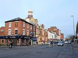 Cottacin designed the Methodist Church in Sidwell Street, Exeter, England, built between 1902 and 1907. As with other buildings, the structure combined reinforced concrete and reinforced brick. The red brick wall is made of two 3 inches (76 mm) brick skins joined across a 20 inches (510 mm) cavity by reinforced diaphragms.[15] Each brick has four perforations. Vertical wires run through these perforations, and are interwoven with horizontal wires that run through each bed joint.[16] Inside, a gallery 13 feet (4.0 m) wide is cantilevered from three walls. The roof has an octagonal dome with 2 inches (51 mm) of reinforced concrete resting on an inner skin of reinforced brickwork.[15] A decorative lantern tower and ventilation turret tops the dome.[16] There are ornate moldings around the doors and windows that look like stone but in fact are reinforced concrete.[17]