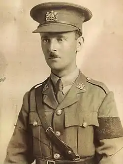 In 1916, his commission came through while at home in England, and he left for France as a second lieutenant in the 19th Manchester Regiment. He was wounded on the first day of the Battle of Passchendale in the Summer of 1917 and was returned to Netley Hospital on Southampton Water, where he was to stay for the next nine months recovering from his wounds.