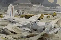 At the start of World War Two Nash was appointed by the War Artists' Advisory Committee to a full-time salaried war artist post attached to the Royal Air Force and the Air Ministry. Nash was unpopular with the Air Ministry representative on the WAAC committee, partly because of the modernist nature of his work and partly because the RAF wanted the WAAC artists to concentrate on producing portraits of their pilots and aircrew.[39] Whilst still a salaried WAAC artist Nash produced two series of watercolours, Raiders and Aerial Creatures. Raiders, or Marching Against England, was a set of studies of crashed German aircraft set in English rural landscapes with titles such as Bomber in the Corn, The Messerschmidt in Windsor Great Park and Under the Cliff. Whilst the Air Ministry could appreciate the patriotic intent and propaganda value of those works, the Aerial Creatures series, with its anthropomorphic depictions of British aircraft, displeased the Air Ministry so much they insisted Nash's full-time contract was ended in December 1940. The Chairman of WAAC, Kenneth Clark was aghast at this development and in January 1941 the Committee agreed to put aside £500 to purchase works from Nash on the theme of aerial conflict.[40][41] Nash worked intermittently under this arrangement until 1944 to produce four paintings for WAAC. The first two of these were Totes Meer (Dead Sea) and Battle of Britain.