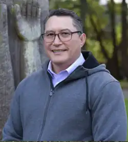 ![]() Standing in front of a Lək̓ʷəŋən Peoples' totem at the University of Victoria, 2024 | |