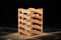 Song (2004): Commissioned by the BBC following its television series 100 Greatest Britons, in which Winston Churchill was voted the greatest Briton. The abstract tower, made of twenty interlocking units of sawn green English heart oak, reflects Churchill’s use of poetry and rhythm in his speeches. De Monchaux said that he "was struck by Churchill's awareness of the way in which the shape of the spaces around words can amplify their meaning". Facsimiles of four original speech drafts are embedded in the sculpture. Song toured several venues including Westminster Hall before joining the collection of the Henry Moore Foundation. It is currently on display at Leeds City Art Gallery. [1][2]