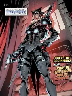 As Warmaster, Paula began to assemble a group of female supervillains who have faced Wonder Woman in the past. She started with Devastation, who had been fighting with the hero Firebrand.[6] The pair made their headquarters in Norway, and Warmaster revealed to Devastation that when she touched the Spear of Gudra, she heard the voices of her valkyrie ancestors who demanded Warmaster destroy the Amazons who had betrayed them.[7] Warmaster later traveled to Canada and recruited Armageddon, a descendant of ogres that had previously fought Wonder Woman.[8] Lastly, Warmaster released Genocide from her tomb deep within a cave near the Tyrrhenian Sea.[9]