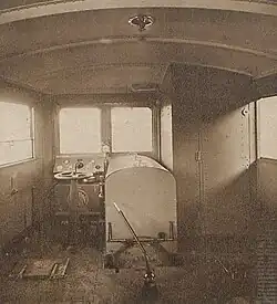 The interior layout accommodates 61 passengers seated in a single class on varnished plywood-covered benches offering rudimentary comfort to say the least.[21] The luggage compartment can carry a ton of cargo or six standing passengers.[21] The front end houses the driver's cab, the engine compartment - covered by a hood - and a toilet.[21]