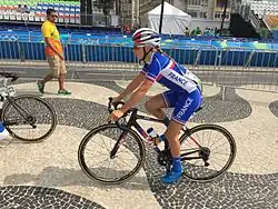 Pauline Ferrand-Prévot (French pronunciation: [polin fɛʁɑ̃pʁevo]; born 10 February 1992) is a French cyclist who rides for UCI Women's World Tour team Visma–Lease a Bike.[5] In addition to road racing, Ferrand-Prévot has also competed in mountain biking and cyclo-cross during her career,[6] winning the world title in each discipline. During the 2015 season, aged just 23, she became the first person in the history of cycling to simultaneously hold the world road title, world cyclo-cross title and world cross-country mountain bike title.[7]