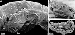 - ^ a b c d e Waloszek, Dieter; Maas, Andreas; Olesen, Jørgen; Haug, Carolin; Haug, Joachim T. (September 2014). "A eucrustacean from the Cambrian 'Orsten' of Sweden with epipods and a maxillary excretory opening". Palaeontology. 57 (5): 909–930. Bibcode:2014Palgy..57..909W. doi:10.1111/pala.12094.