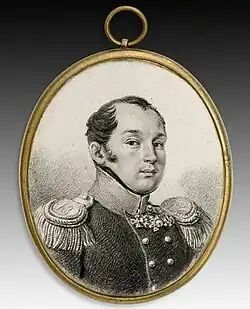 Pavel Pestel was born in Moscow on 5 July [O.S. 24 June] 1793.[1] He came from a Lutheran family of Saxon descent that had settled in Russia during the reign of Peter the Great. His great-grandfather, grandfather, father and uncle had all successively served as director of Moscow's postal mail service, forming a dynasty of sorts.[2] His father Ivan (1765–1843) continued to work his way up through the political bureaucracy to become Governor-General of Siberia from 1806 to 1821.[1] Ivan Pestel, together with his associate Nikolai Treskin, the governor of Irkutsk, established a corrupt regime in Siberia and was eventually dismissed.[3]
