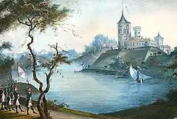 A wooden fortress was built by Russians on the place of Pavlovsk and was known from at least 13th century as part of an Administrative division of Novgorod Land. The fortress and the entire region were later captured by the Swedes. On 13 August 1702, the Russian army led by Peter the Great and Fyodor Apraksin met Swedes at the Izhora river and pushed them to the fortress. For several days, the Swedish Army was reinforcing their positions but were expelled upon a surprise frontal attack.[3]