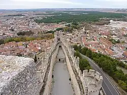 Wing of the Peñafiel Castle overlooking the town of Peñafiel and the Duero valley lined with pinewoods