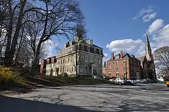 The Peabody Civic Center Historic District encompasses a well-preserved portion of the historic center of Peabody, Massachusetts. Extending along Chestnut and Franklin Streets south of Peabody City Hall, the district includes a small residential area built in the mid-19th century, as well as the city hall and St. JOhn the Baptist Roman Catholic Church, two monumental structures defining the town's civic heart. The district was added to the National Register of Historic Places in 1980.[1]