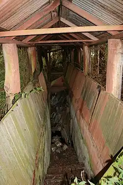 Rectangular in plan, the narrow concrete formed cavity runs east/west with the stepped exit ramp at the west end. The long sides of the dip are lined with vertical, half-height timber boards fixed to sawn timber rails. The dip is sheltered by a gable roof supported by round timber posts, framed with sawn timber and clad with corrugated iron sheeting.[1]