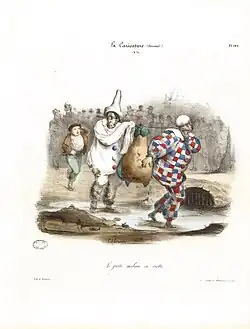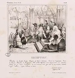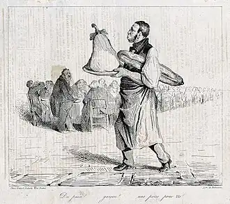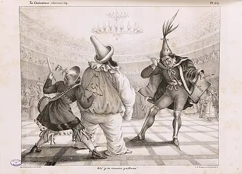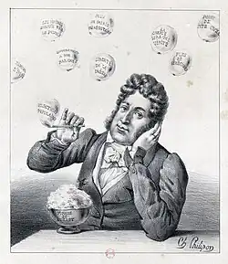 Charles Philipon was born in Lyon in 1800, the son of a wallpaper merchant. At the age of 23, he moved to Paris to pursue an artistic career.[47] To support himself, he initially worked for image makers on Rue Saint-Jacques and for manufacturers of labels and rebuses, illustrating numerous affordable story sheets.[48] From 1824 onward, he began studying lithography[49] while specializing in producing individual works, which were sold as separate sheets.[50] His early works were focused on popular subjects, including fashion series, caricatures of manners, and comic advertisements, although they did not stand out as exceptional.[51]