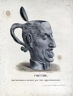 In April 1830, La Silhouette published Un jésuite, a vignette by Philipon depicting Charles X.[58] The caricature represented the liberals' opposition to the ultra-royalists, with Jesuitism serving as a symbol of their political stance.[59] The illustration was discreetly placed within the publication to avoid censorship.[60] Following the release, the issue was seized, and at the trial, the prosecutor argued that the image unmistakably depicted the King.[61][62] The deputy director of the publication, Benjamin-Louis Bellet, fined and sentenced to six months in prison, while Philipon, who had not signed the caricature, avoided punishment.[63] Despite this, the incident helped establish Philipon’s reputation as a political caricaturist.[64][N 5][63]
