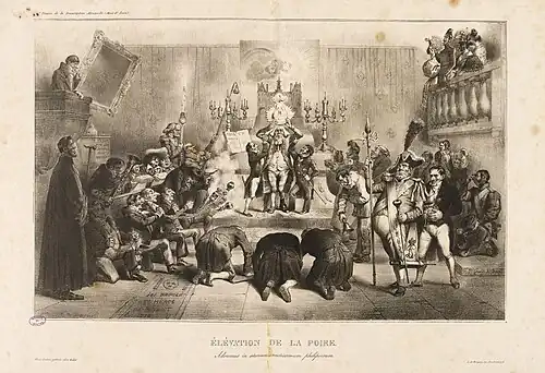 The pear became closely associated with King Louis-Philippe and is considered an emblem of the July Monarchy.[4][5] This association has led to two common misconceptions: the belief that "pear" referred to a fool at the time, justifying its use, and the incorrect attribution of the emblem's creation to Honoré Daumier, when Charles Philipon claiming it as his own.[6][7]