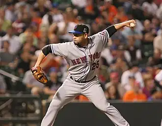 Feliciano began his third stint with the Mets when he was re-signed on February 28, 2006,[2] a couple of weeks after the beginning of spring training. He initially started the season with the Norfolk Tides to make up for the time he had missed in spring training,[3] but he was recalled on April 17 and became a permanent fixture in the Mets bullpen as a left-handed specialist.[12] He recorded his first major league save against the Philadelphia Phillies on June 30, 2007.[2][13] He operated in the bullpen as the Mets' primary situational left-hander in 2008 and 2009.[14]