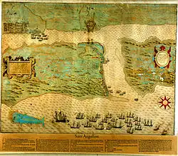 Pedro Menéndez Márquez was the son of Marquis Alonso ("El Mozo") and Maria Alonso Arango ("La Moza"). He had four siblings: Alonso, Juan, Catalina and Elvira Menéndez Marqués.[4] Márquez began serving with his uncle Pedro Menéndez de Avilés in about 1548, occasionally as master of ships under his uncle's command. As Pedro Menéndez de Avilés was preparing his expedition to found a colony in Florida, he appointed Márquez as second-in-command of the fleet sailing from Asturias. After the founding of St. Augustine and the expulsion of the French from Fort Caroline, Márquez was dispatched to carry the official report to Spain, in command of the ships returning there for supplies. Although Márquez was not the first to bring news of Menéndez de Avilés' success to King Phillip II, the king nevertheless awarded him 300 gold ducats. Márquez then loaded supplies for the new colony and sailed for Florida, but other ships in Menéndez de Avilés' fleet were prevented from leaving Spain.[5]