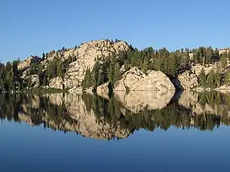 Peeler Lake is a California landform within the Toiyabe National Forest and on the west edge of the Hoover Wilderness.[2] One of the few bodies of water on the Great Basin Divide,[3] Peeler Lake's inflow is sufficient for outlet streams over 2 Sierra Crest sills of similar elevation to respectively drain westward to the Pacific Ocean (Rancheria Creek, Tuolumne & San Joaquin Rivers, and Suisun & San Francisco Bays) and eastward into the Great Basin (Robinson Creek, East Walker & Walker Rivers, Walker Lake sink).[4] Peeler Lake's saddle area is a mountain pass between the west Sierra slope (Tuolumne County) and the Sierra Escarpment (Mono County) to the east, and the lake level of 9,488 ft (2,892 m) is over 1,000 ft (300 m) below the summits of Cirque Mountain (north) and Crown Point (south).[1] The namesake Peeler Lake Trail of 1.5 mi (2.4 km) from the east reaches the lake from the Robinson Creek Trailhead parking at the west side of Twin Lakes[5] (formerly Mono Village), and the Bridgeport Ranger Station issues overnight permits for the backcountry area of the lake.[6]
