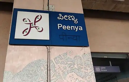 Peenya is an elevated metro station on the North-South corridor of the Green Line and the interchange for the upcoming Orange Line of Namma Metro serving the Peenya area of Bengaluru, India. It was opened to the public on 1 March 2014.[1][2]