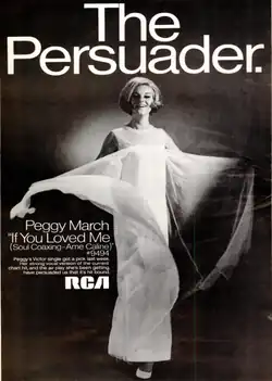 Peggy March (born Margaret Annemarie Battavio, March 8, 1948)[1] is an American pop singer. In the United States, she is primarily known for her 1963 million-selling song "I Will Follow Him".[2] Although she is sometimes remembered as a one-hit wonder, she continued to have success in Europe well into the 1970s.