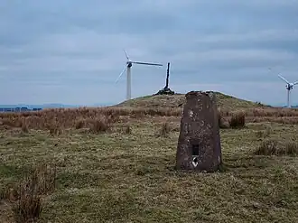 Pegwn Mawr is a mountain in Powys, Mid Wales, east of Llanidloes. It is 586 m (1,922 ft) high. It is surrounded by a wind farm. There is a trig point (pictured)